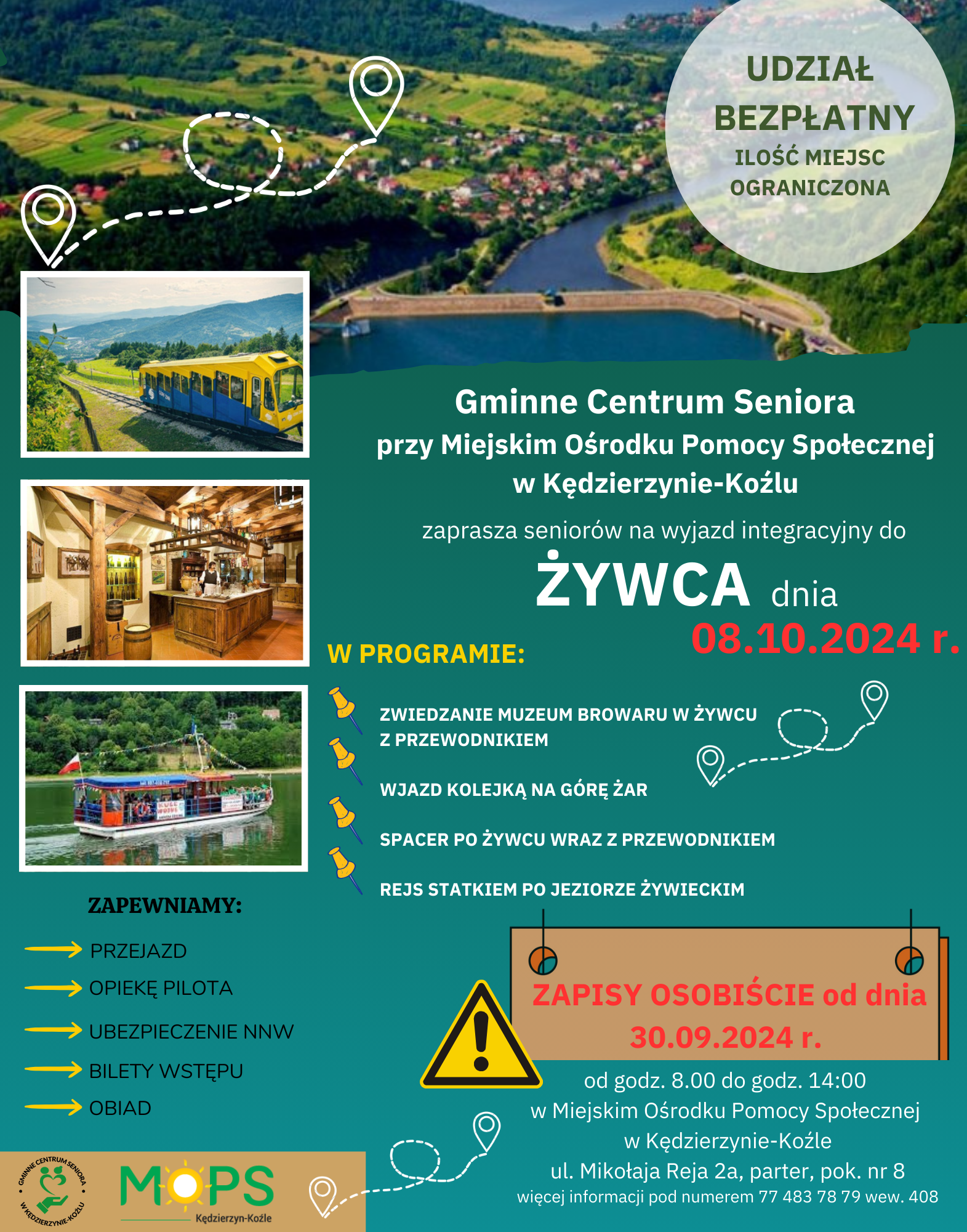 Gminne Centrum Seniora przy Miejskim Ośrodku Pomocy Społecznej w Kędzierzynie-Koźlu, zaprasza do udziału w bezpłatnym wyjeździe integracyjnym do Żywca dnia 8.10.2024 r.