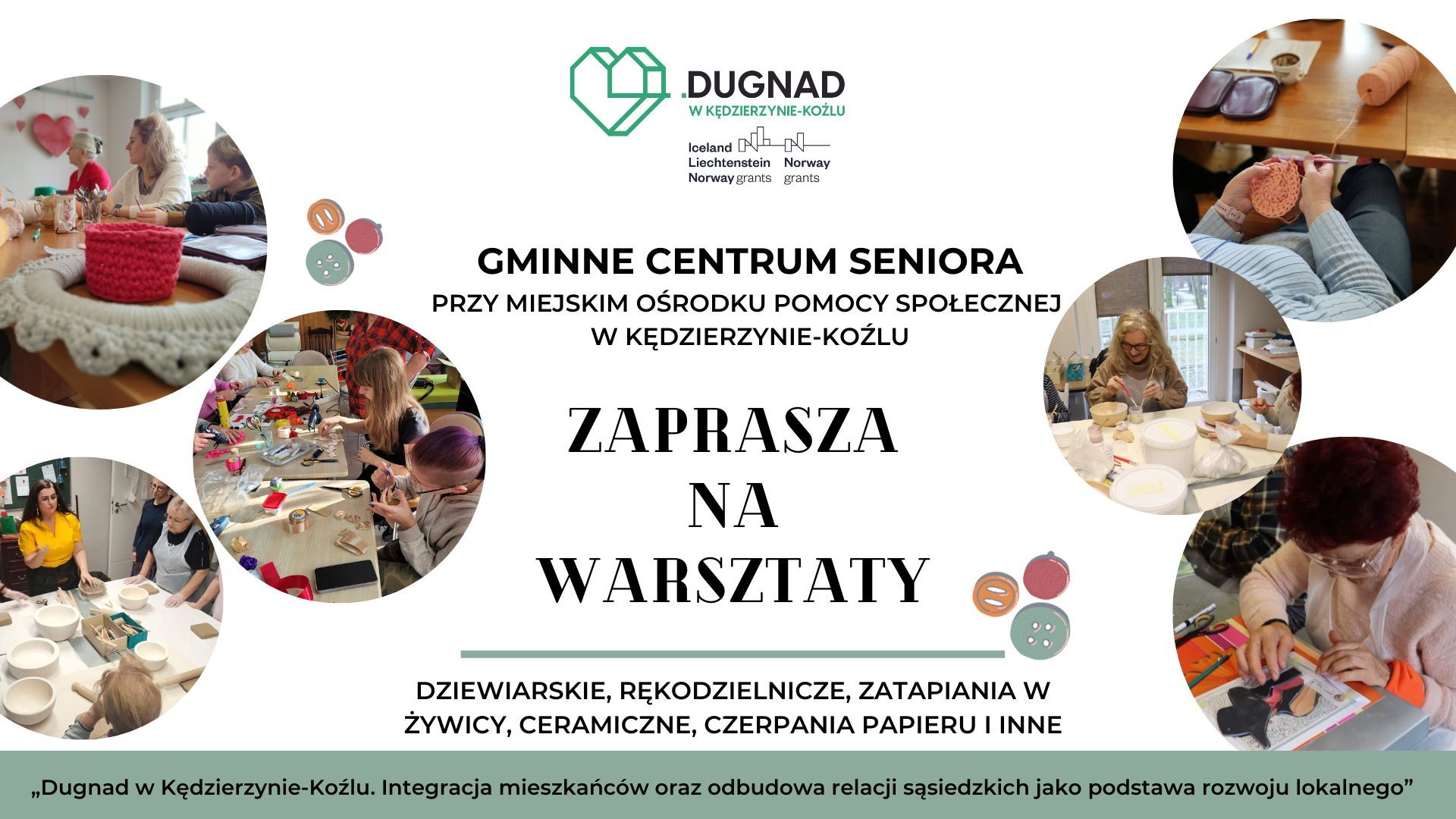 WARSZTATY- Gminne Centrum seniora przy Miejskim Ośrodku Pomocy Społecznej w Kędzierzynie-Koźlu zaprasza na warsztaty: DZIEWIARSKIE, RĘKODZIELNICZE, WITRAŻOWE, CERAMICZNE, CZERPANIA PAPIERU I INNE. OBOWIĄZUJĄ ZAPISY!! WIĘCEJ INFORMACJI POD NUMEREM 77 483 78 79 WEW. 408 "Dugnad" Wspólnie działamy na rzecz Europy sprzyjającej integracji społecznej.