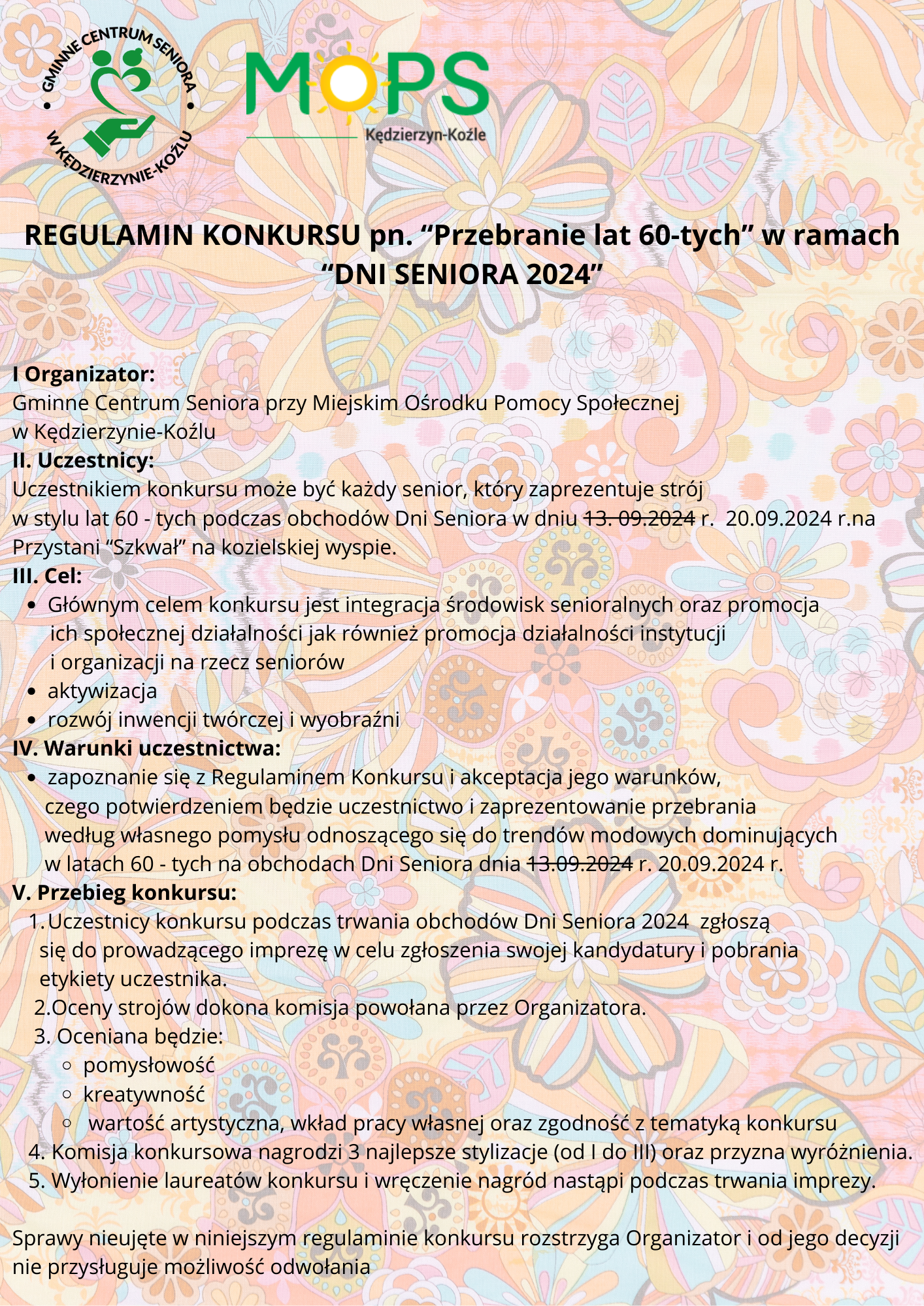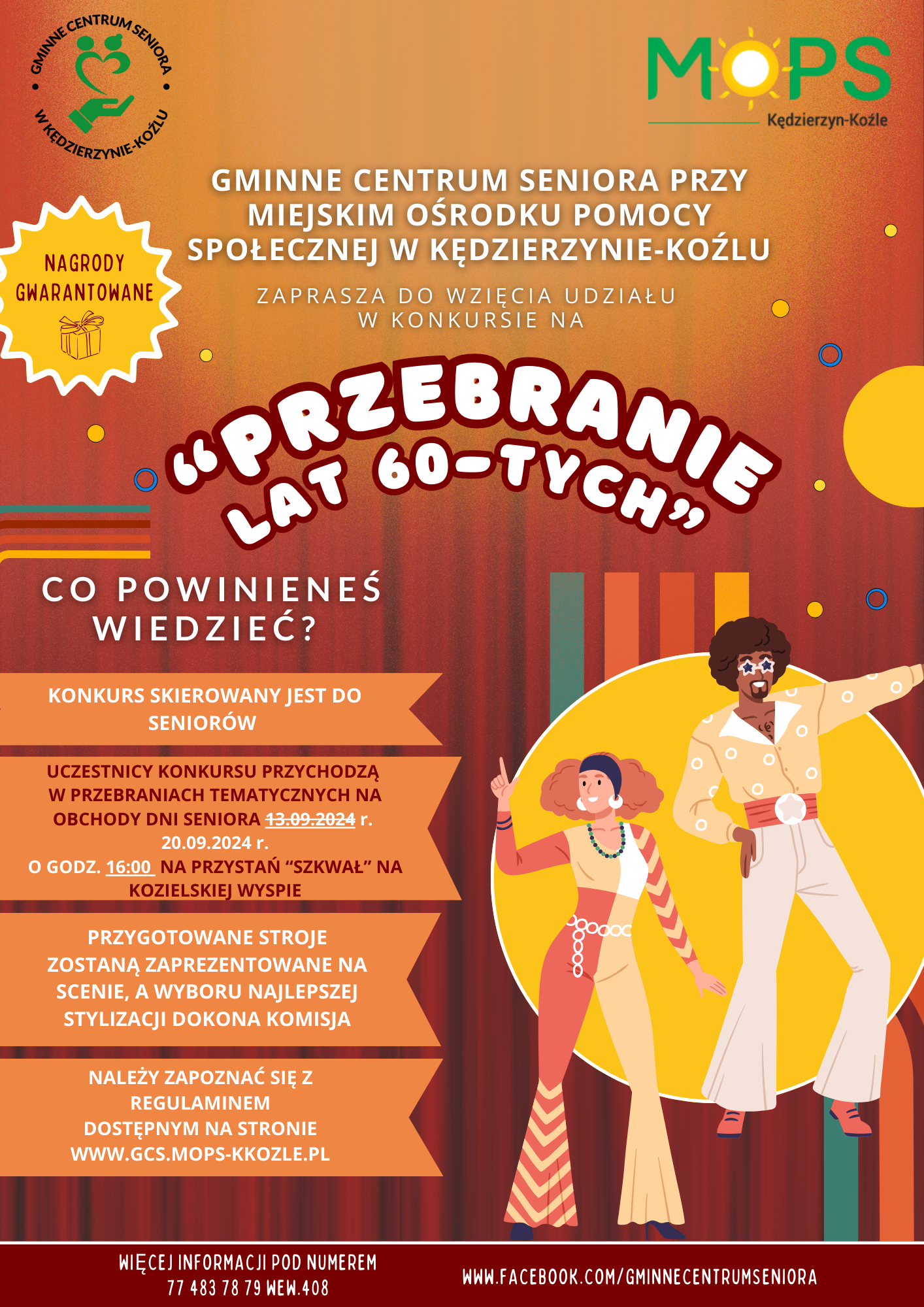 Gminne Centrum Seniora przy Miejskim Ośrodku Pomocy Społecznej w Kędzierzynie-Koźlu zaprasza seniorów do udziału w konkursie na "Przebranie lat 60-tych". Konkurs skierowany jest do seniorów. Uczestnicy przygotują stroje według własnej inwencji twórczej i zaprezentują swoją stylizację na uroczystych obchodach "Dni Seniora 2024" dnia 13.09.2024 r. na przystani "Szkwał" w godzinach 16.00- 19.00. Wyboru najlepszej stylizacji dokjonuje komisja.