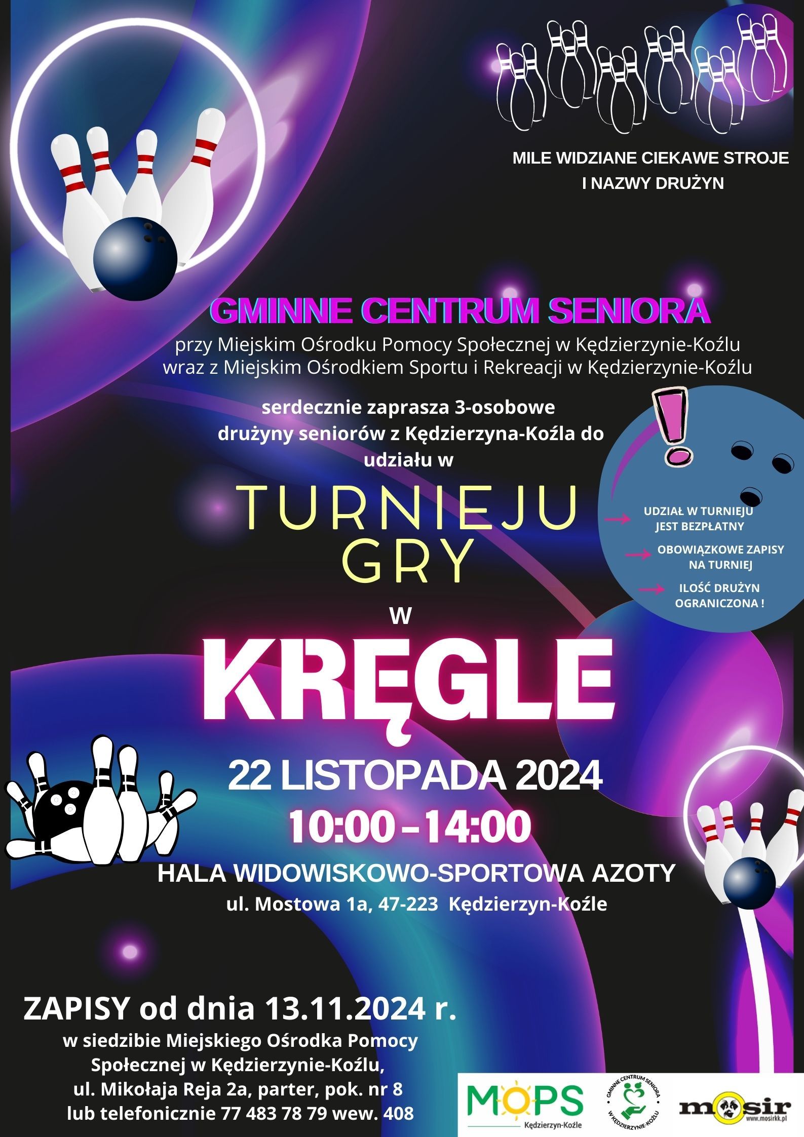 Zapraszamy do zapisów od dnia 13.11.2024 r. osobiście w siedzibie Miejskiego Ośrodka Pomocy Społecznej wKędzierzynie-Koźlu przy ul. Mikołaja Reja 2a lub telefonicznie pod numerem 77 483 78 79 wew. 408