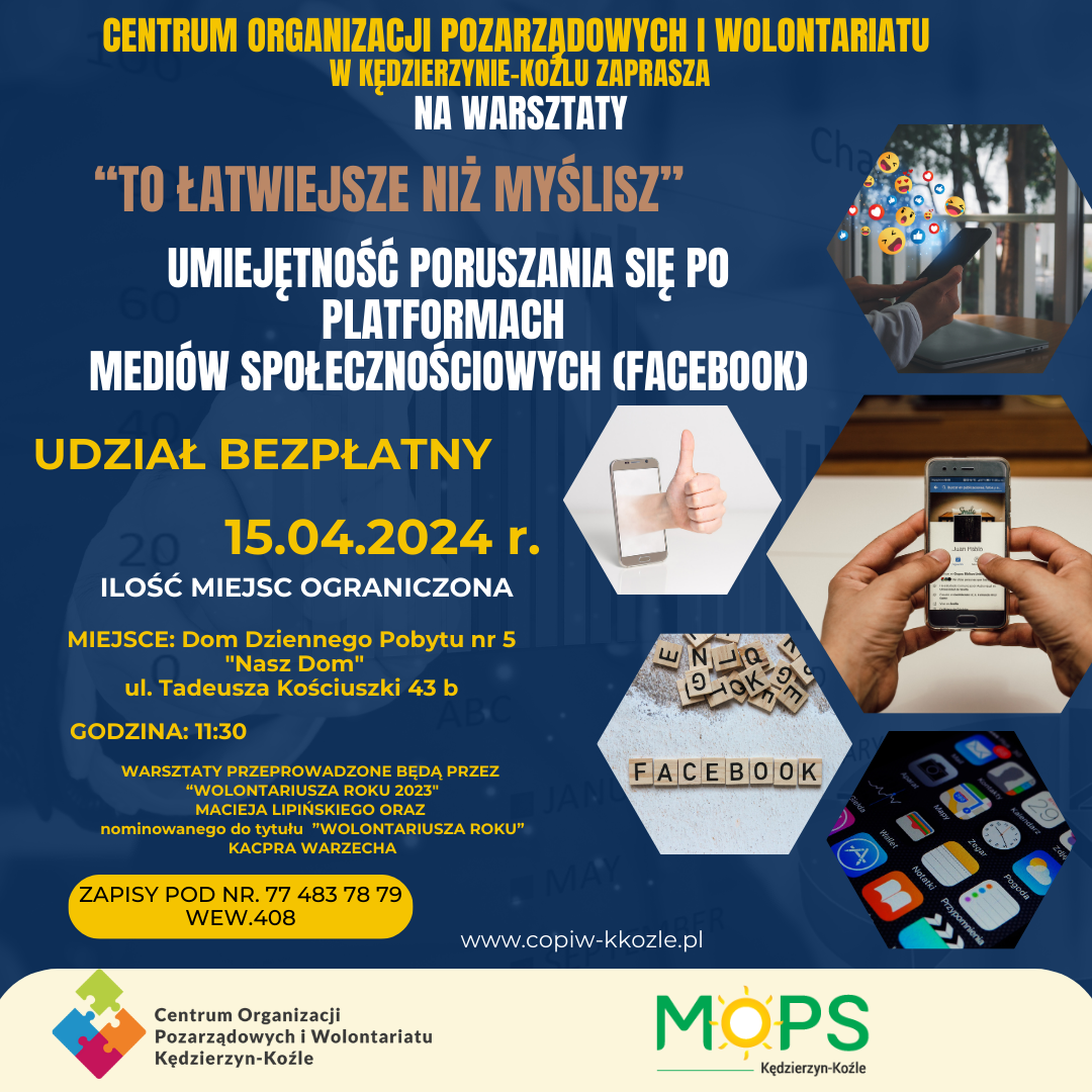 Zapraszamy do skorzystania z BEZPŁATNYCH warsztatów dotyczących poruszania się po platformach mediów społecznościowych (FACEBOOK) zorganizowanych przez Centrum Organizacji Pozarządowych i Wolontariatu w Kędzierzynie-Koźlu https://www.facebook.com/COPiWKK/ wspólnie z wolontariuszami z Zespołem Szkół Żeglugi Śródlądowej w Kędzierzynie-Koźlu.