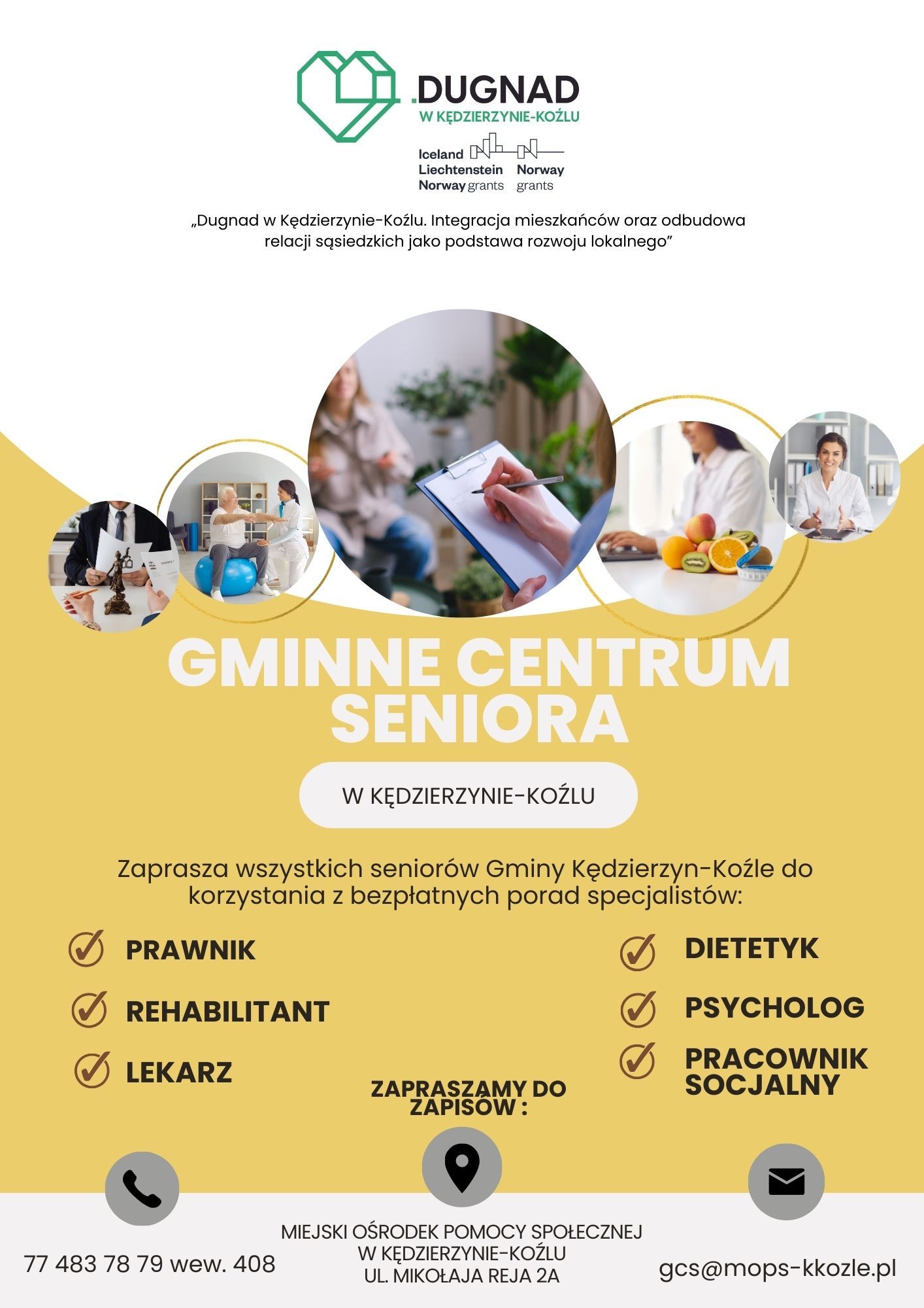 Zapraszamy do zapisów pod numerem 77 483 78 79 wew. 408 pod adresem Miejski Ośrodek Pomocy Społecznej ul. Mikołaja Reja 2a 47-224 Kędzierzyn-Koźle bądź Ten adres pocztowy jest chroniony przed spamowaniem. Aby go zobaczyć, konieczne jest włączenie w przeglądarce obsługi JavaScript.